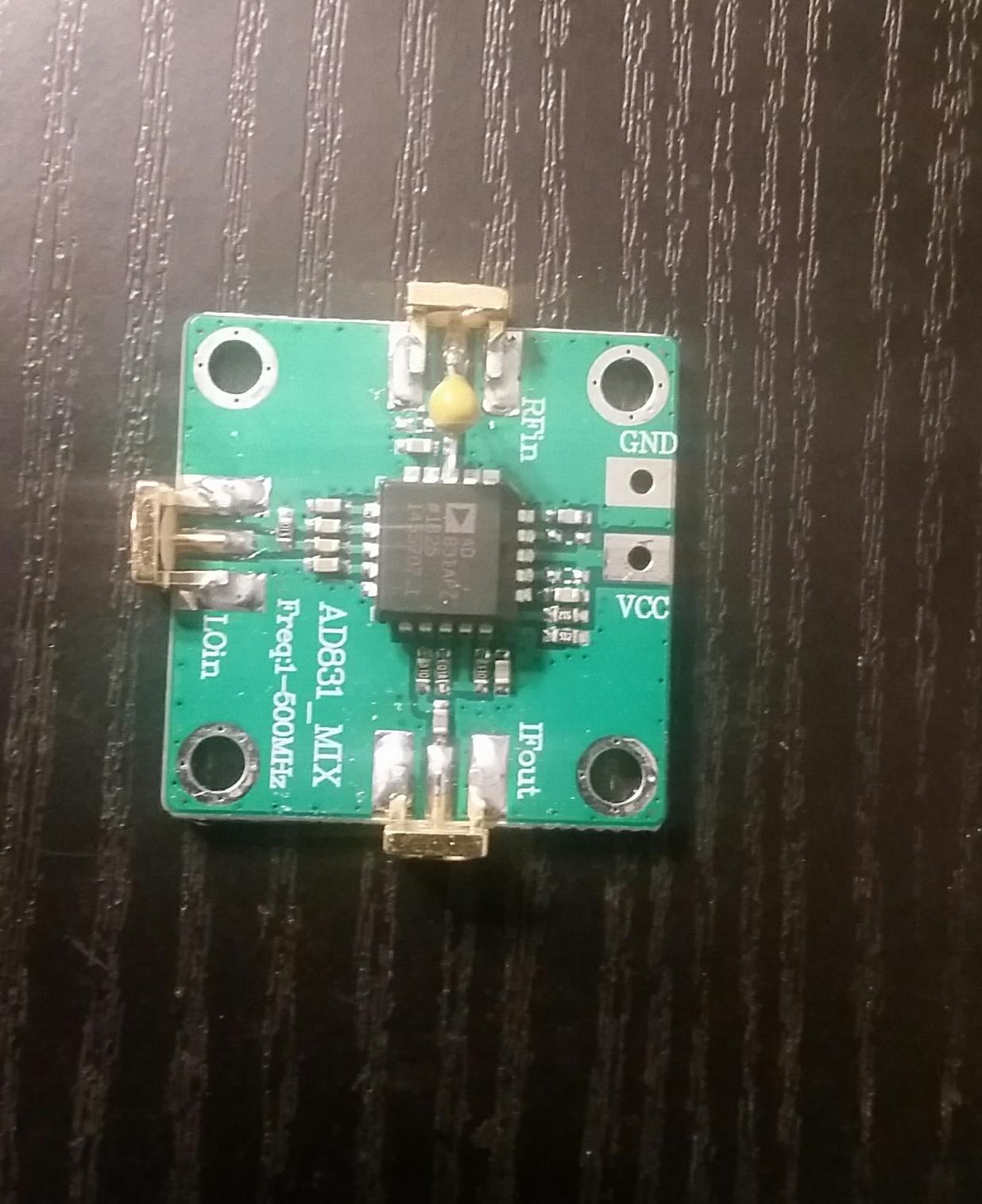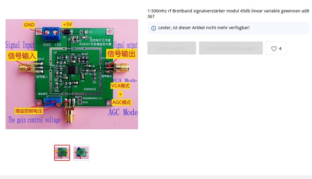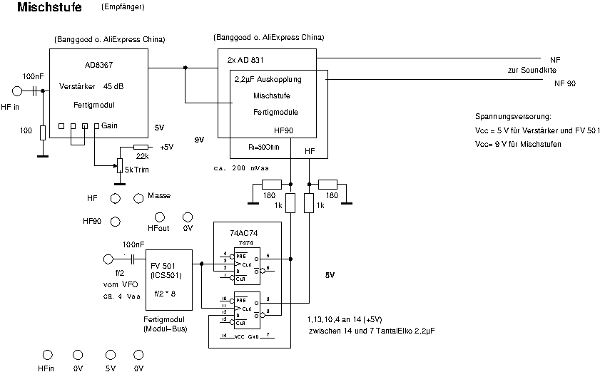 The RX-Mixer is a small board from China. I added an 8 times frequency-multiplier (from AK-Modul-Bus) to get the max. Frequency of 120 MHz. This signal is devided by 4 using two FlipFlops to get two signals with a Phase difference of 90 degrees (3,5 MHz to 30 MHz). With two of these Mixers I get the IQ-Signals for the Stereo Sound card (24 Bit, Delock 61961 or 63926). In Front of this I use a RF-Amplifier-Board from China.