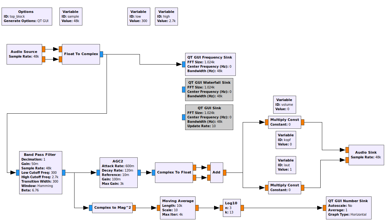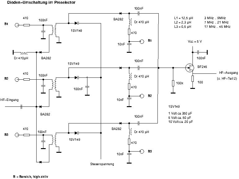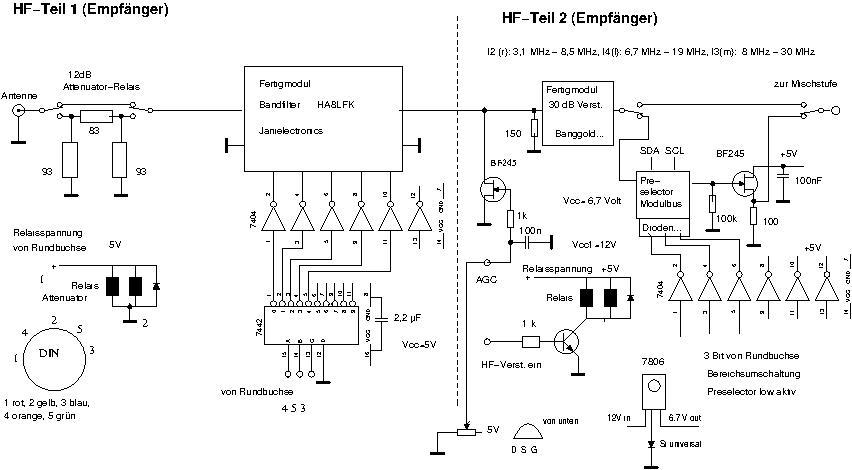 The following diagram shows the RF-Part of the receiver using a hungarian Filter switched by Diodes and a homemade RF-Amplifier with 3 resonant circuits, tuned by C-Diodes (Diagram).