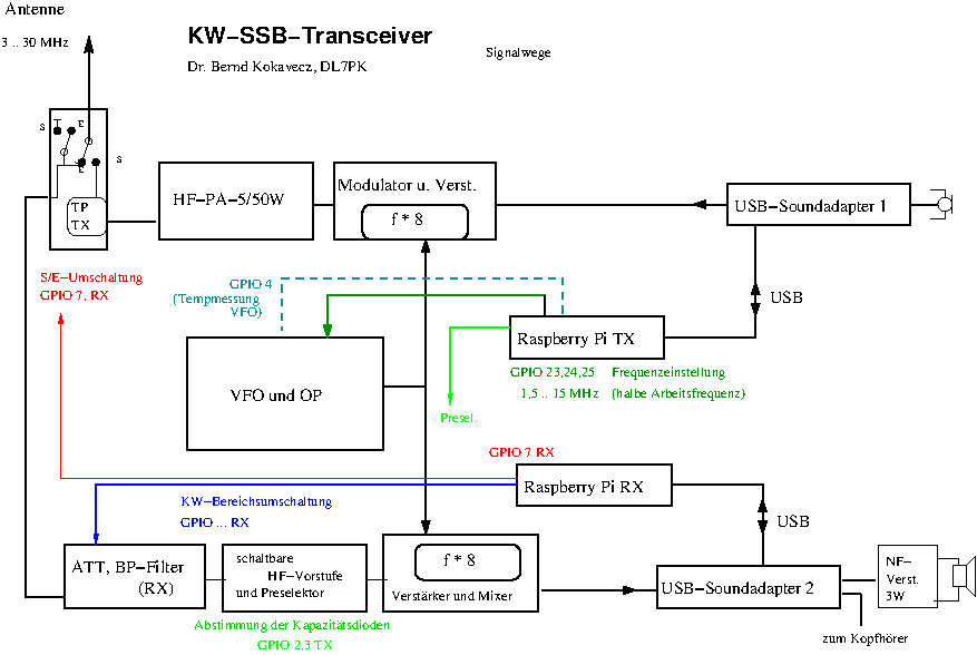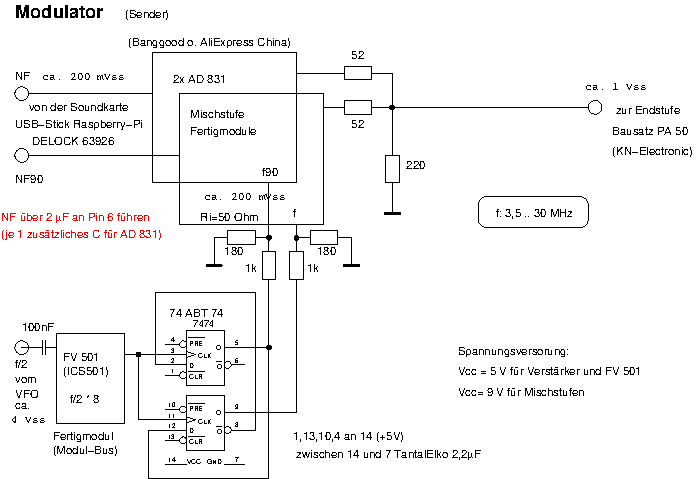 I use a DDS-Generator from AK-Modul-Bus (0 to 24 MHz) to generate the VFO-Signal. It is controlled by the TX-Raspberry-Pi (1,75 MHz to 15 MHz) and followed by an OPAMP. (Foto).