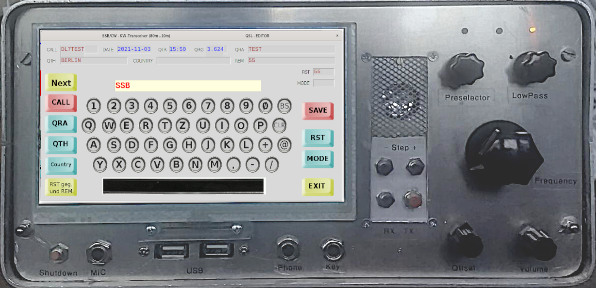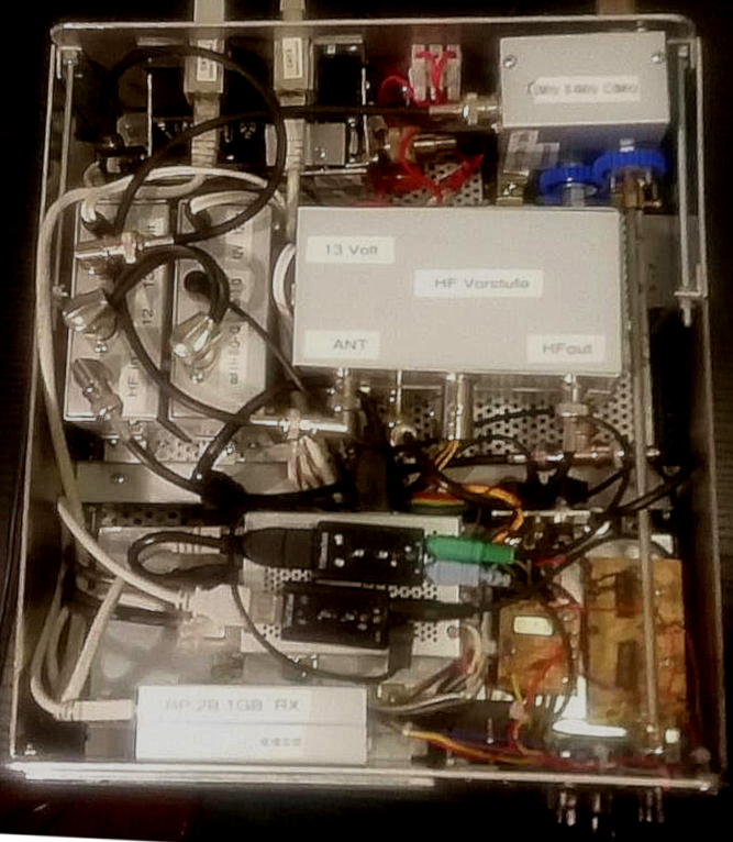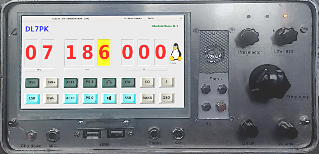 This homebrewed QRP-transceiver was designed and built by myself between 2018 and 2021. I use SDR technology for signal processing (2 Raspberry Pies with high-quality USB sound cards) and I also use a number of analog modules. It is designed for amateur bands between 80m and 10m and has an output from 5 Watt to 30 Watt (more with external equipment). (Top View).